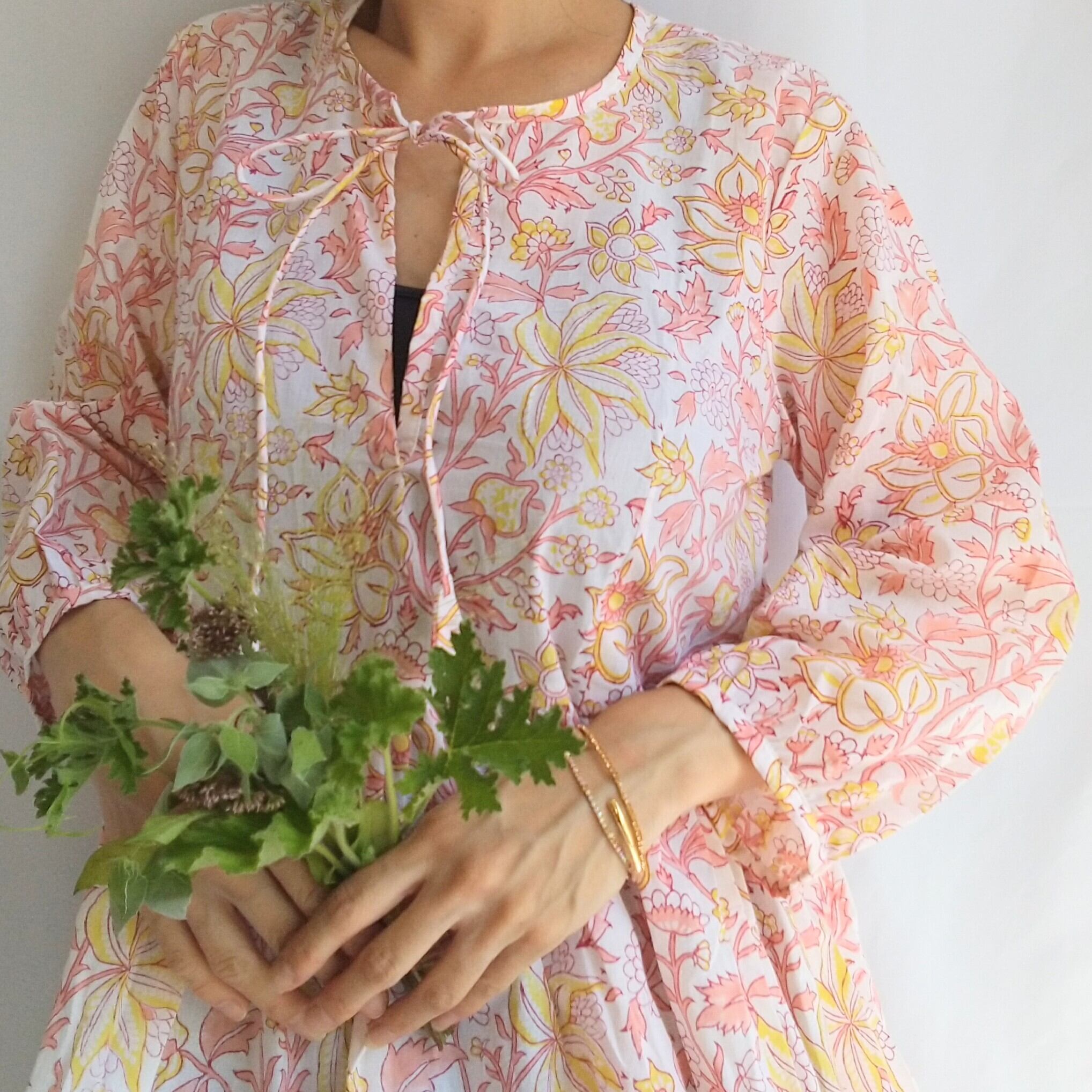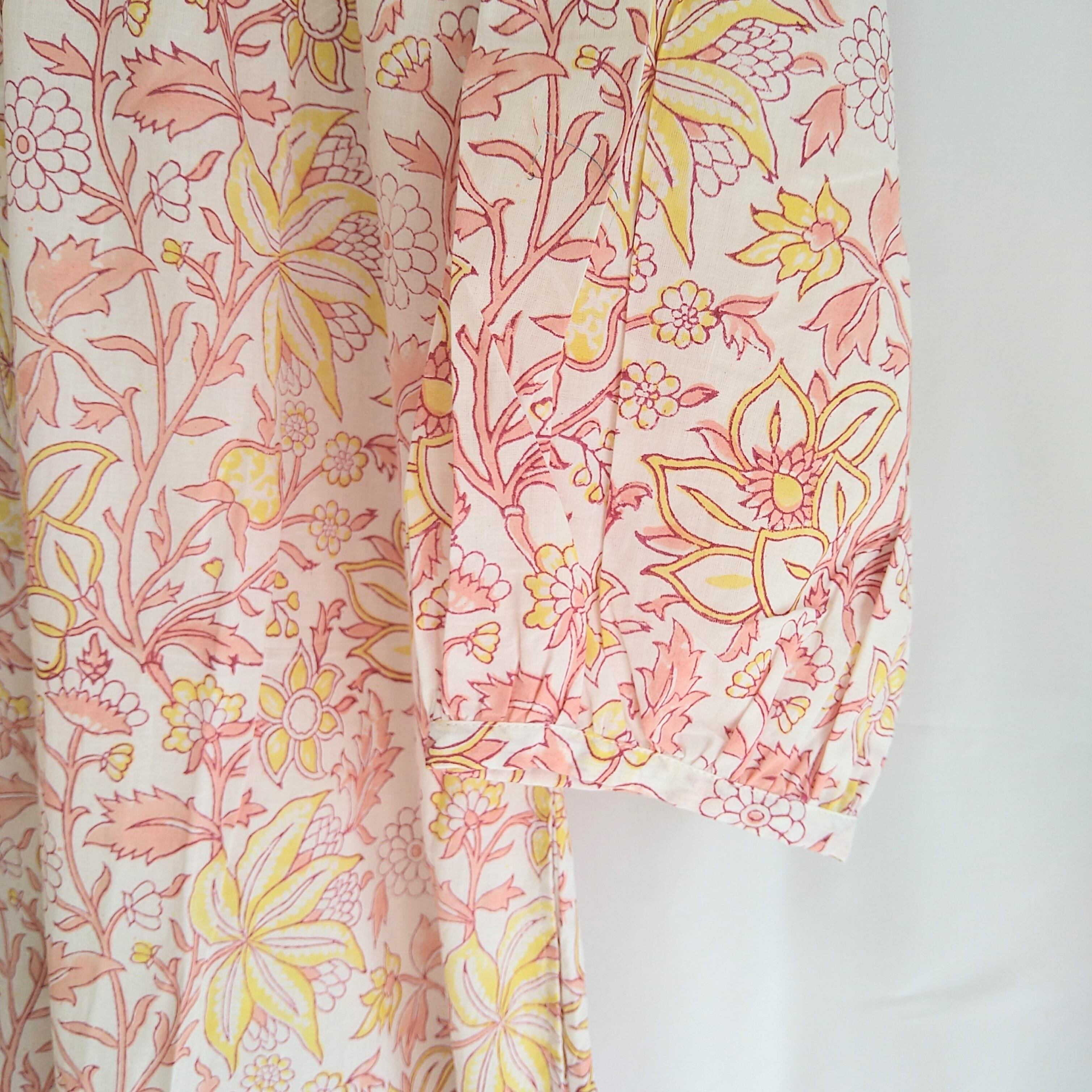 ギャザーロングワンピース#2 ホワイト✕ピンク・イエローMIX花柄