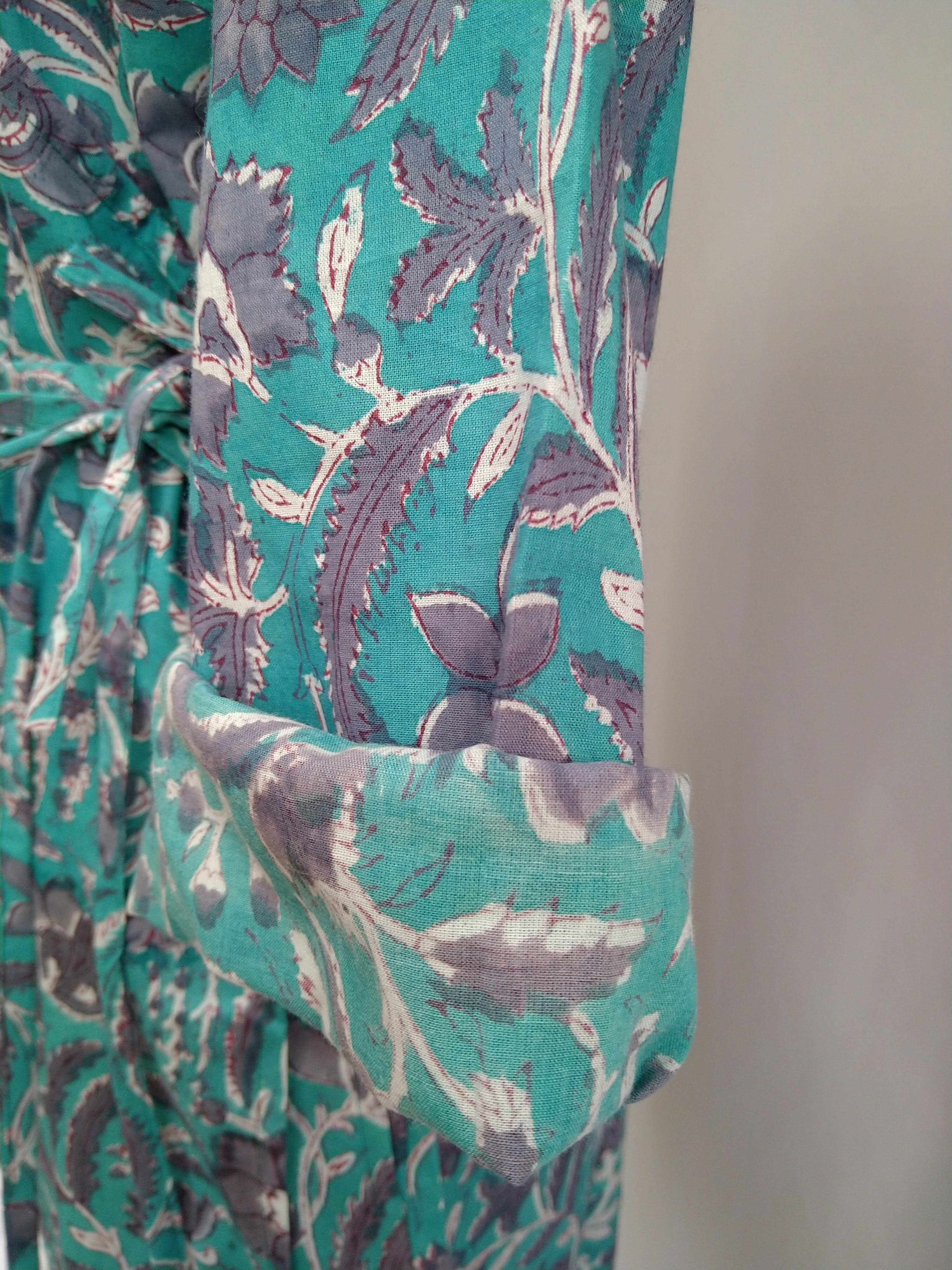 カシュクールワンピース#2 ターコイズグリーン✕グレー花柄